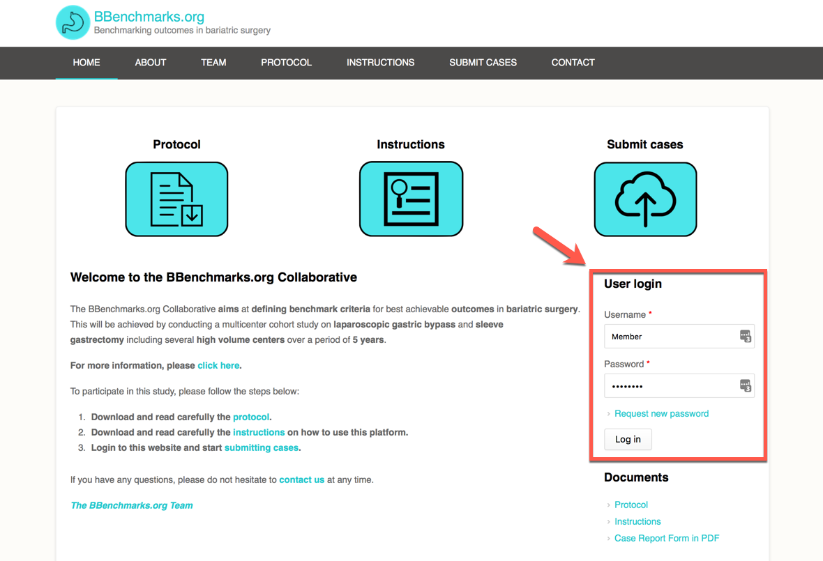 - Login to the website to access all necessary study documents and submit your cases online. To do so, please type in your username and password at the "User Login" menu available at the ride-side bar of the website (see image below) or simply use the following link: