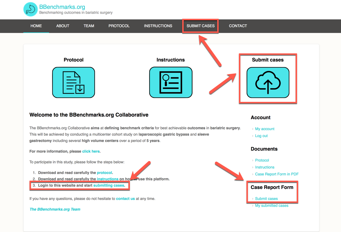 - Please ensure that you have carefully read the study protocol before attempting entering cases at our Data Entry Management System (DEMS). To do so, please click on the “Protocol” icon shown as shown below. The link to the protocol is also available on the main menu and right side bar of the website in all pages. Alternatively you may directly access the study protocol using the following link: https://bbenchmarks.org/?q=protocol