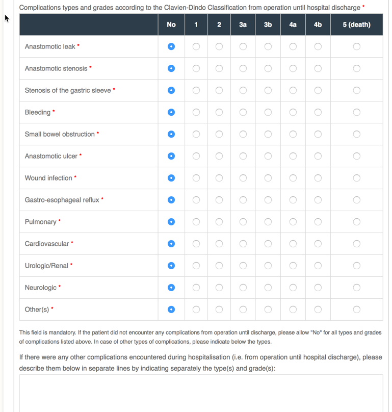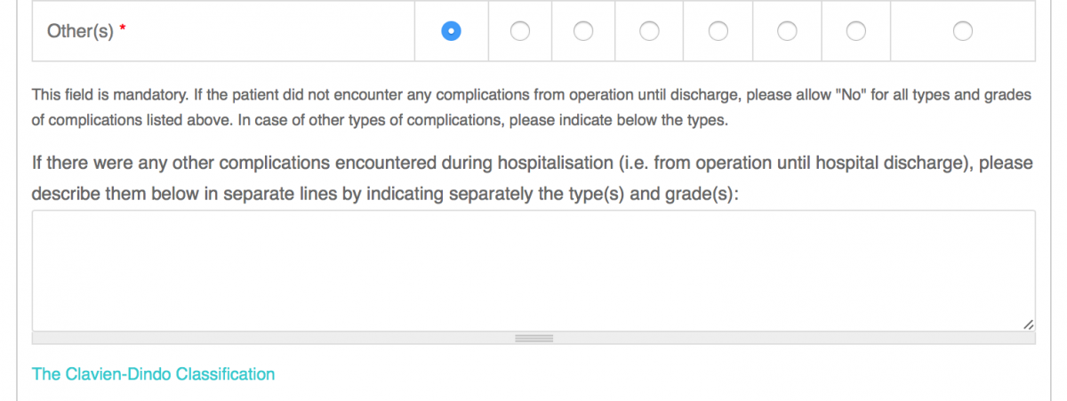 An other important mandatory field is the “Complications types and grades according to the Clavien-Dindo Classification from operation until hospital discharge*” under the section “Postoperative course”.