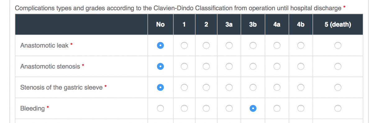 This table (grid) shown in the image above was created to record with a single click the type of as well as the grade of the specific complication according to the Clavien-Dindo Classification of Surgical Complications. The rows correspond to specific types of complications and the columns to their associated grade.